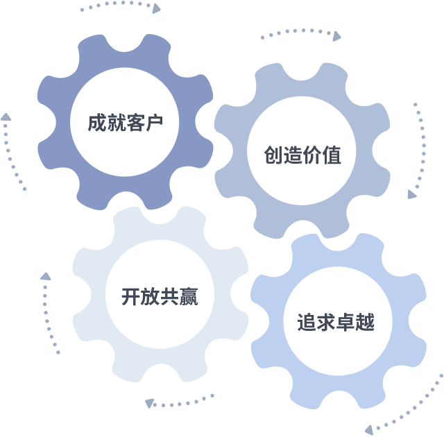 成就客户是一切决策的出发点,创造价值是衡量所有工作的标准,追求卓越是赏金国际做事做人的态度,开放共赢是赏金国际的格局也是最终的结果。价值观的齿轮环环相扣,推动着组织里的每个人不断向前。